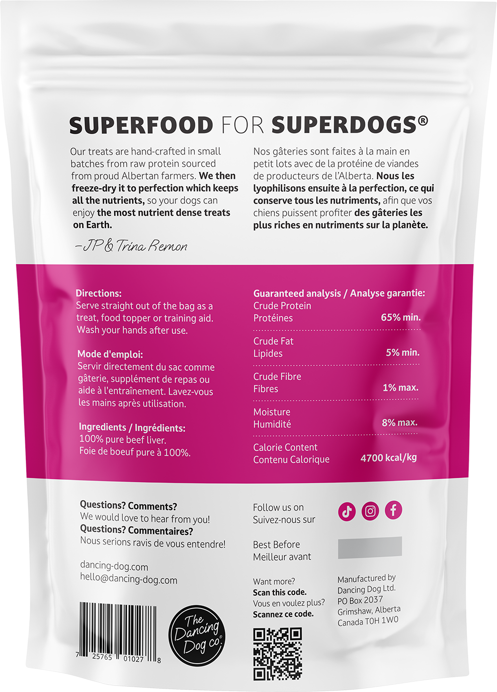 Our treats are hand-crafted in small batches from raw protein sourced from proud Albertan farmers. We then freeze-dry it to perfection which keeps all the nutrients, so your dog can enjoy the most nutrient dense treats on Earth.