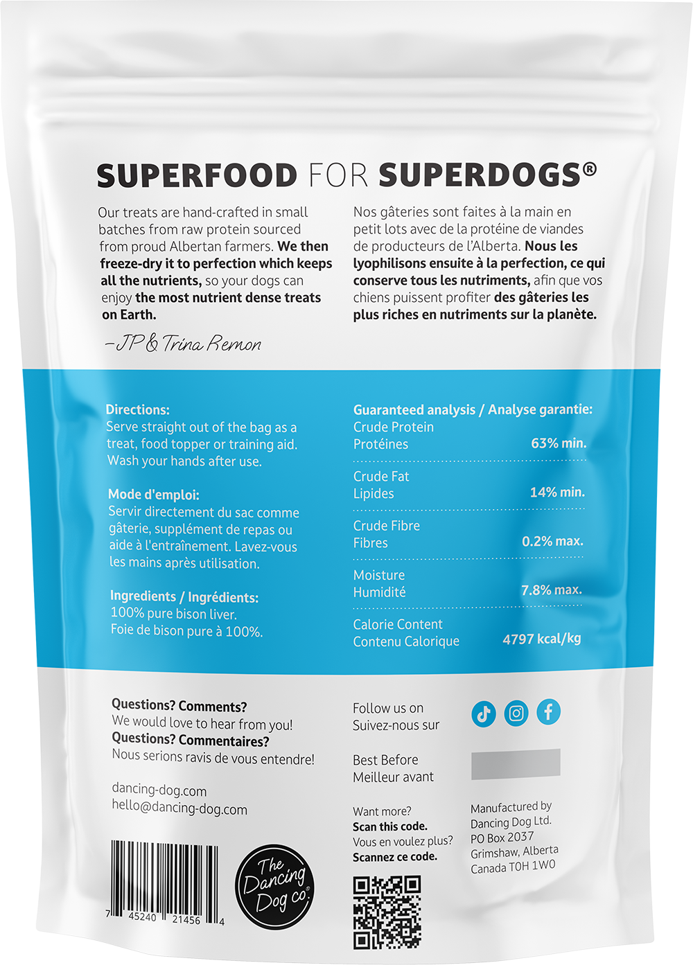 Our treats are hand-crafted in small batches from raw protein sourced from proud Albertan farmers. We then freeze-dry it to perfection which keeps all the nutrients, so your dog can enjoy the most nutrient dense treats on Earth.